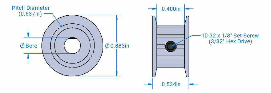 Queste pulegge a 10 denti possono essere inserite internamente ai nostri canali di alluminio. Hanno una larghezza interna (tra le flange) di 10.2 mm (0.4") ed accettano cinghie larghe fino a 9.5 mm (0.375").